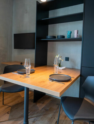 Unsere Apartments sind im modernen südtiroler Stil eingerichtet und voll ausgestattet. Bodentiefes Glas trifft auf Holz und Sichtbeton für ein lichtdurchflutetes Ambiente mit Stil.
